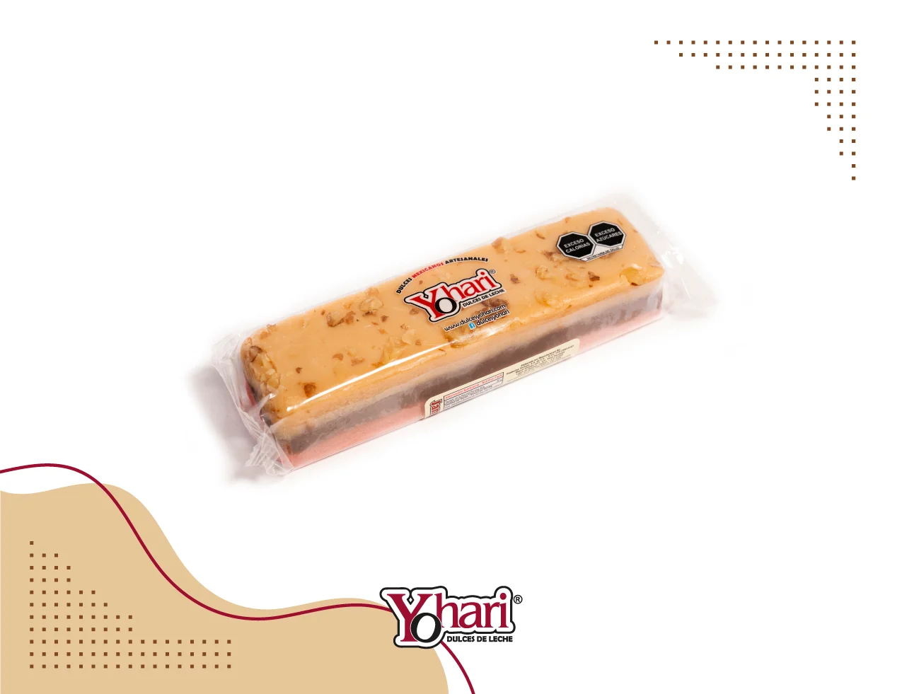 Dulce de leche tricolor sabor leche quemada, cacao natural y suave toque de guayaba natural con trozos de nuez cuidadosamente seleccionados.